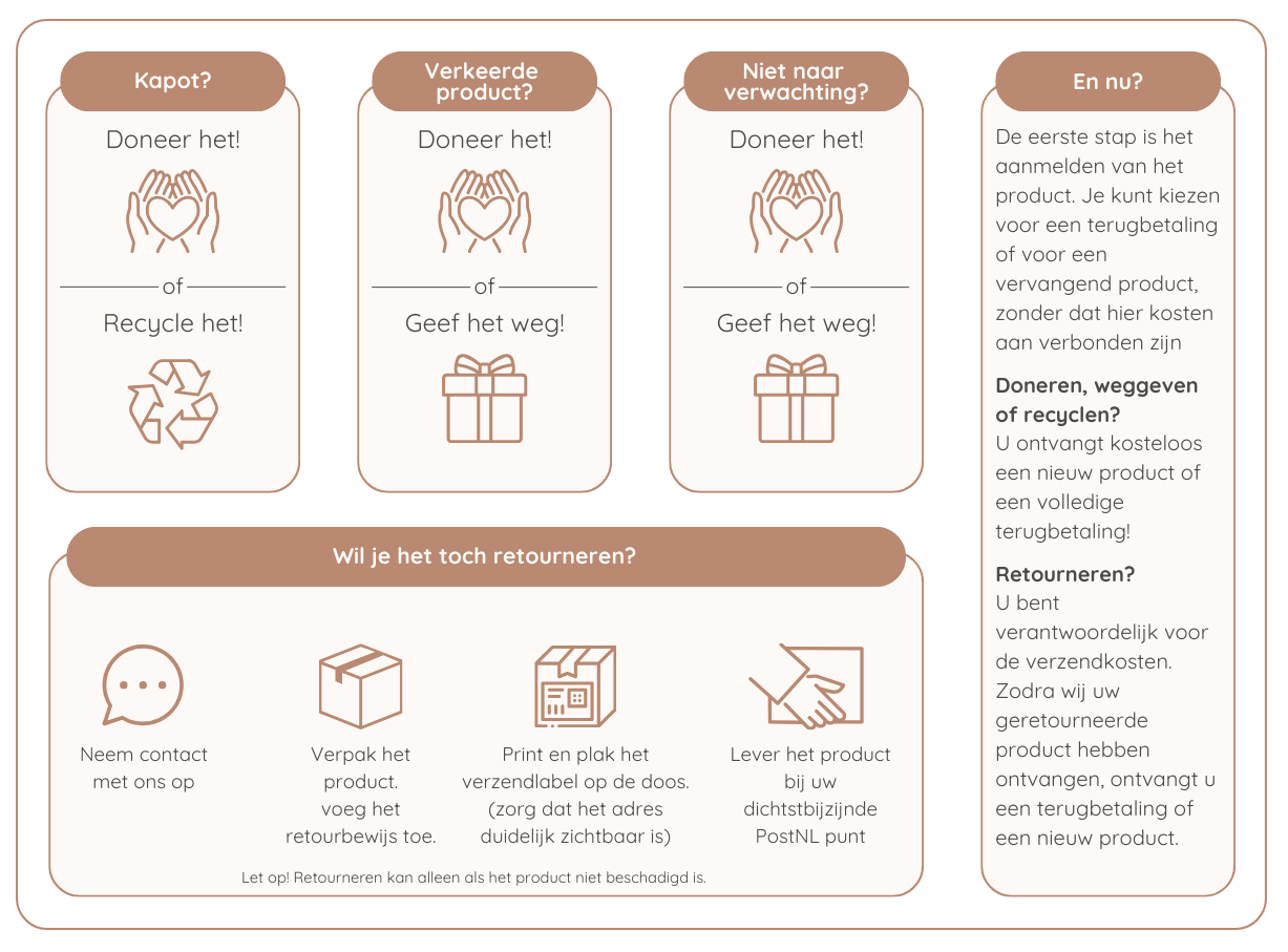 What to do? If your product is damaged, the wrong color, or otherwise does not meet your expectations, you may donate, give away, or recycle the product at your own discretion.