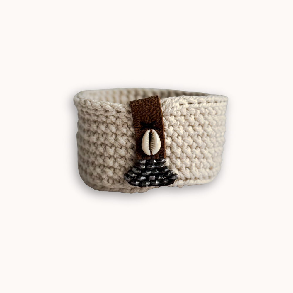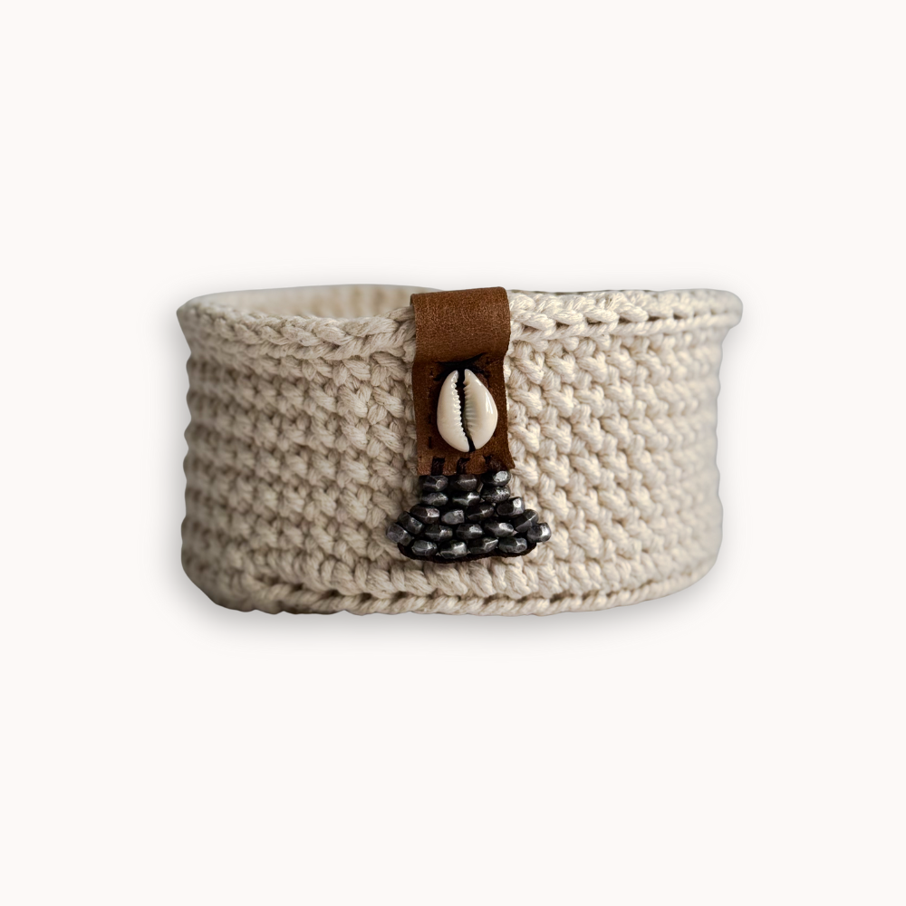 Set van twee handgehaakte manden van katoen, afgewerkt met een leren detail, schelp en steentjes – een subtiele mix van ambacht en elegantie.